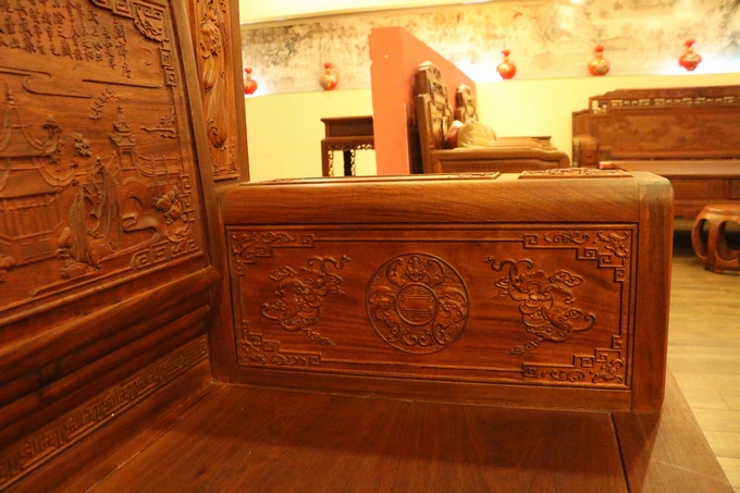 該款沙發整體之表現顯得極為嚴密厚實,無一處鏤空之雕飾,在最上端背板處的中間部分為留有一些花紋之邊幅加以修飾,顯得極為浮美雅觀。而在其左右兩側則另雕繪有“麒麟戲珠”與“雛鳥朝鳳”兩處紋飾圖案:“麒麟戲珠”紋飾設計地較為特別,如草龍紋一般,除頭部精細雕刻外,其余四肢與形體均簡略化,身體部位采用一銜邊條帶狀的紋飾相串于圓珠內,頗顯靈動神韻;而“雛鳥朝鳳”的圖案則是在背板最上部的左右兩端,末端是饒有一圓弧之設計為修飾收尾,顯得極為婉轉柔和圓潤。紋飾的圖案為一只可愛的雛鳥深情脈脈含情注視著前方鳥鳳的場景,顯得實為溫馨。鳳凰處之設計處理地也與前面麒麟一同:頭部細化,其余簡略帶過,鳳凰處眼眸之雕飾顯得極為醒目,神情表現形態逼真,層次感和手觸感亦十分明瀝彰顯,而經燙蠟處理的表面緬花材質表現地也更為細膩淡雅,極盡奢華。